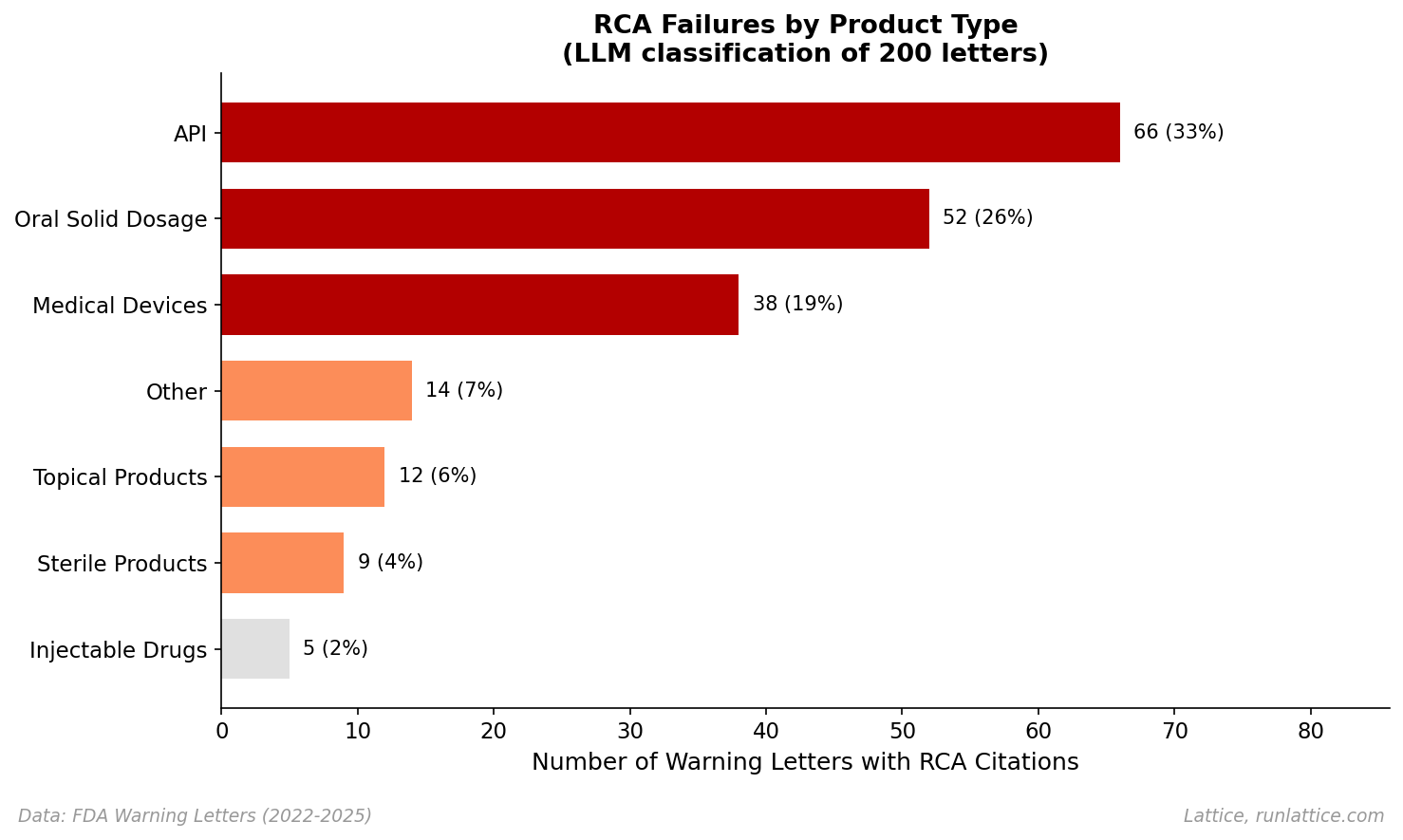 Breaking down the 200 RCA-related letters by product type shows that investigation failures are a cross-cutting capability gap, though some sectors face more scrutiny.